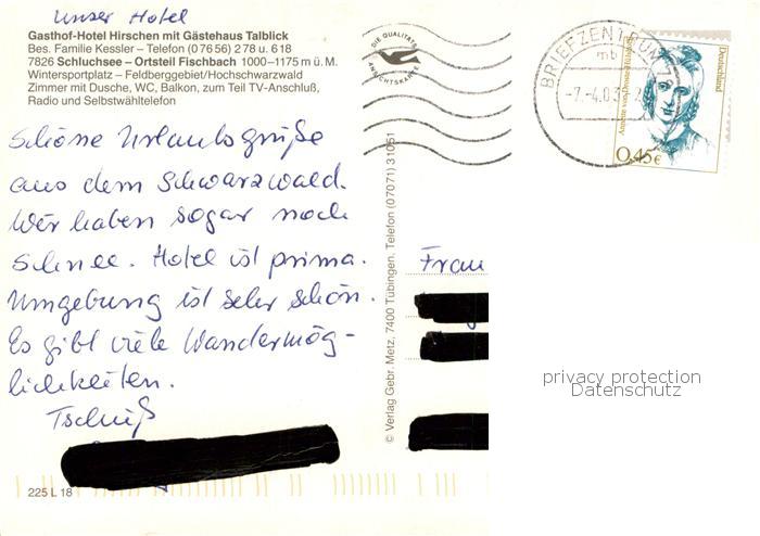 73776311 alte Postkarte Schluchsee Gasthof-Hotel Hirschen m. Gaestehaus Talblick Aussenansicht postalisch gelaufen Erhaltung siehe scans [LiesaD40] KatCode: 11110008315102