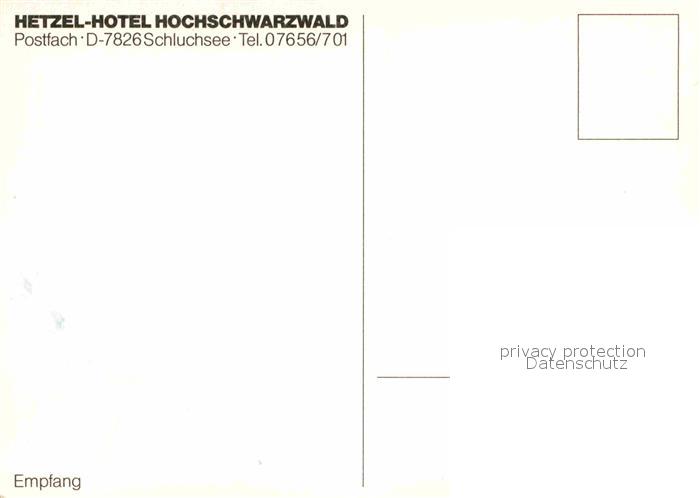 72885813 Schluchsee Hetzel Hotel Hochschwarzwald Empfang postalisch nicht gelaufen Erhaltung siehe scans [FriedD77] KatCode: 11110008315102