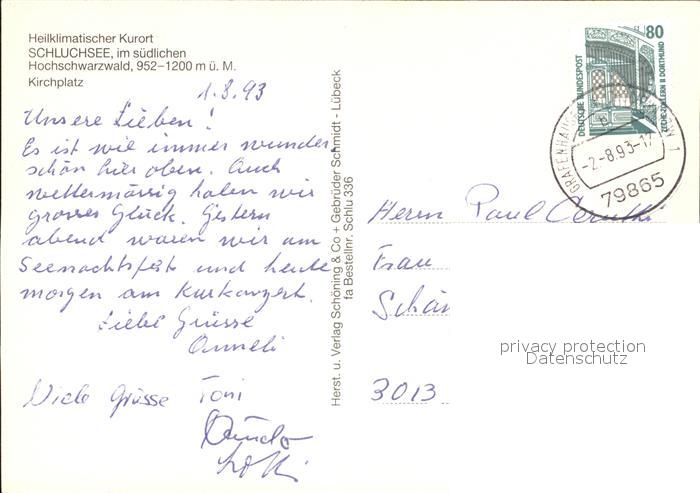 72557580 alte Postkarte Schluchsee Kirchplatz postalisch gelaufen Erhaltung siehe scans [KathaD79] KatCode: 11110008315102