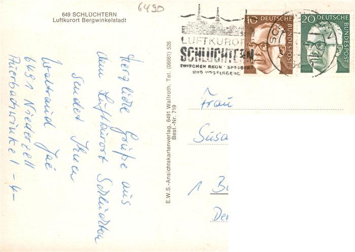 73884138 alte Postkarte Schluechtern Kraemerstrasse Kloster Freischwimmbad Unter den Linden Kinzig Partie Acisbrunnen postalisch gelaufen Erhaltung siehe scans [FriedD77] KatCode: 11110006435025