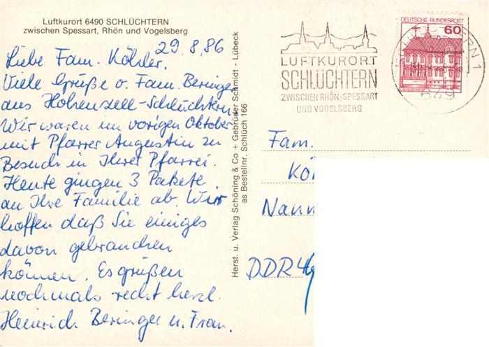 73905022 alte Postkarte Schluechtern Obertorstrasse Rathaus Synagoge Eckebaecker Rathaus Neubau Hallenbad postalisch gelaufen Erhaltung siehe scans [WerneD78] KatCode: 11110006435025