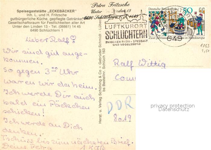 73642084 alte Postkarte Schluechtern Speisegaststaette Eckebaecker postalisch gelaufen Erhaltung siehe scans [WerneD78] KatCode: 11110006435025