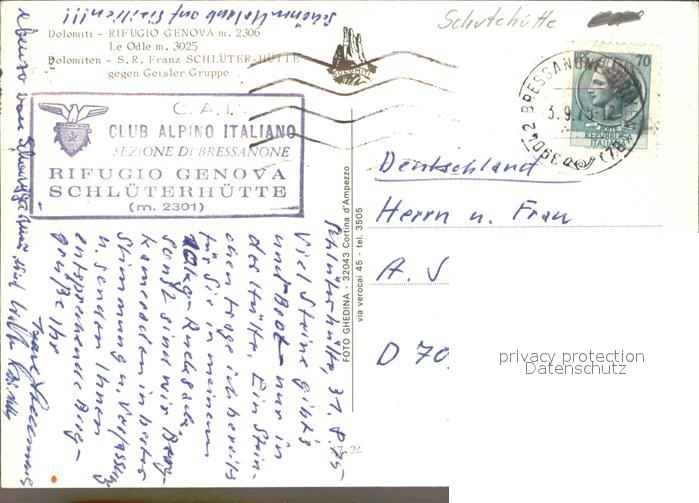 old postcard Schlueterhuette gegen Geislergruppe Schutzhaus Dolomiten postalisch gelaufen Erhaltung siehe scans