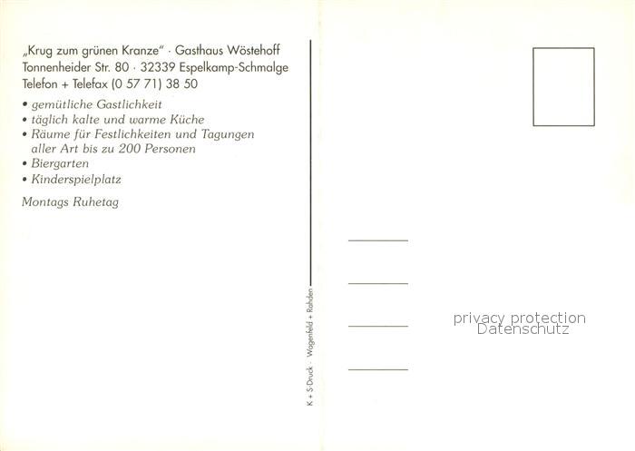 73687461 Schmalge Gasthaus Woestehoff Krug zum gruenen Kranze postalisch nicht gelaufen Erhaltung siehe scans [FriedD77] KatCode: 11110005770008