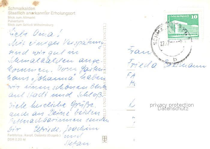 72972710 alte Postkarte Schmalkalden Thueringen Blick zum Altmarkt Pulverturm Schloss Wilhelmsburg postalisch gelaufen Erhaltung siehe scans [FriedD77] KatCode: 11110016066063