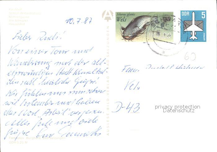 72237057 alte Postkarte Schmalkalden Thueringen Kirchhof Schloss Wilhelmsburg Mohrengasse Altmarkt Hessenhof Fachwerkhaus Wappen postalisch gelaufen Erhaltung siehe scans KatCode: 11110016066063