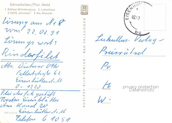 72747154 alte Postkarte Schmalkalden Thueringen Schloss Wilhelmsburg Lutherhaus HOG Ehrental Altmarkt postalisch gelaufen Erhaltung siehe scans [FriedD77] KatCode: 11110016066063