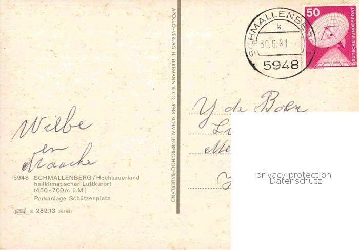 72655068 alte Postkarte Schmallenberg Park Schuetzenplatz postalisch gelaufen Erhaltung siehe scans [LiesaD40] KatCode: 11110005958040