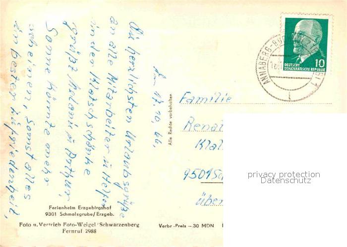 72704938 alte Postkarte Schmalzgrube Ferienheim Erzgebirgshof postalisch gelaufen Erhaltung siehe scans [AndreD76] KatCode: 11110014171190