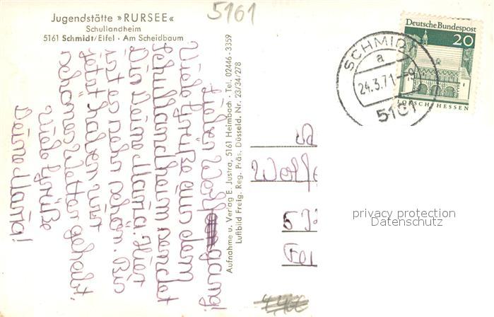 73691482 alte Postkarte Schmidt Nideggen Jugendstaette Rursee Schullandheim Fliegeraufnahme Blick zur Rurtalsperre postalisch gelaufen Erhaltung siehe scans [FriedD77] KatCode: 11110005358044