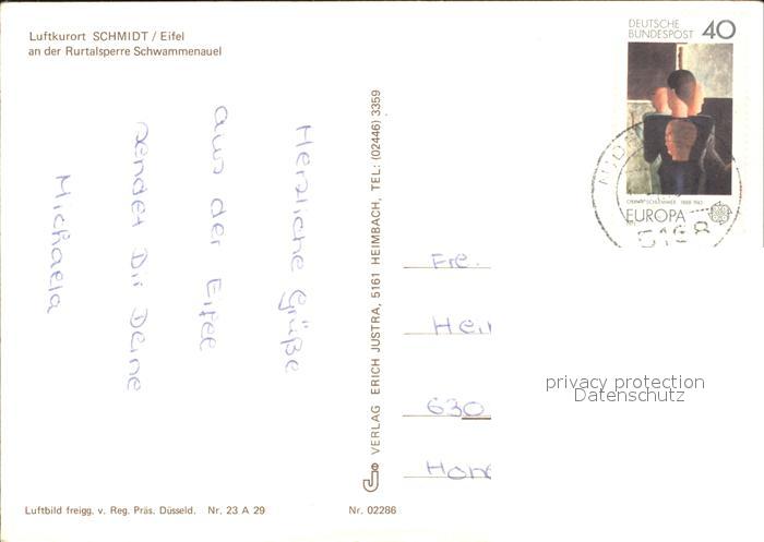 72261075 alte Postkarte Schmidt Rurtalsperre Schwammenauel Luftkurort Fliegeraufnahme postalisch gelaufen Erhaltung siehe scans KatCode: 11110005358044