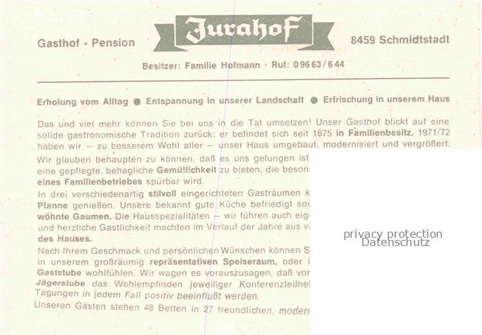 74049439 Schmidtstadt Panorama Gasthof Pension Jurahof postalisch nicht gelaufen Werbekarte (keine Postkarte) Erhaltung siehe scans [FriedD77] KatCode: 11110009371140