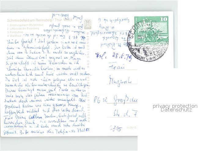 72198996 alte Postkarte Schmiedefeld Rennsteig Erholungsheim Stutenhaus Liftbaude Eisenberg Filmbuehne Waldbad postalisch gelaufen Erhaltung siehe scans KatCode: 11110016070046
