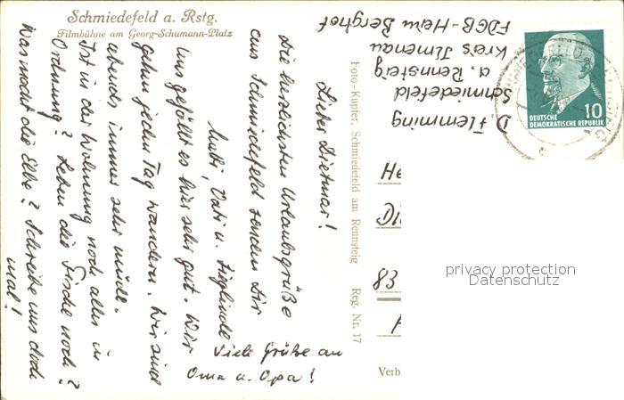 72009705 alte Postkarte Schmiedefeld Rennsteig Filmbuehne Georg Schumann Platz postalisch gelaufen Erhaltung siehe scans KatCode: 11110016070046