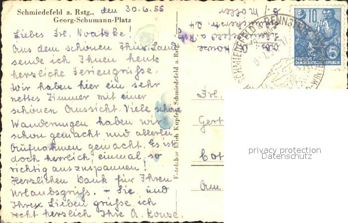 72010066 alte Postkarte Schmiedefeld Rennsteig Georg Schumann Platz postalisch gelaufen Erhaltung siehe scans KatCode: 11110016070046