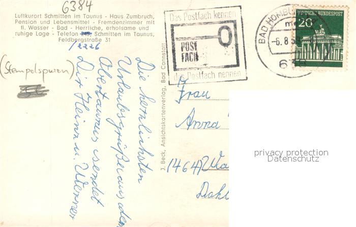 73705494 alte Postkarte Schmitten Taunus HAus Zumbruch Pension postalisch gelaufen Erhaltung siehe scans [LiesaD40] KatCode: 11110006434009