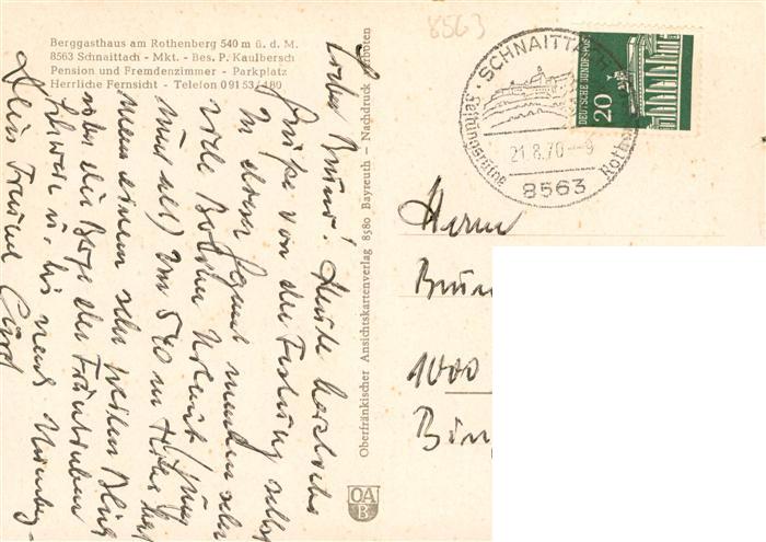 73932674 alte Postkarte Schnaittach Berggasthaus Rothenberg Gaststube Bruecke postalisch gelaufen Fliegeraufnahme Erhaltung siehe scans [WerneD78] KatCode: 11110009574155