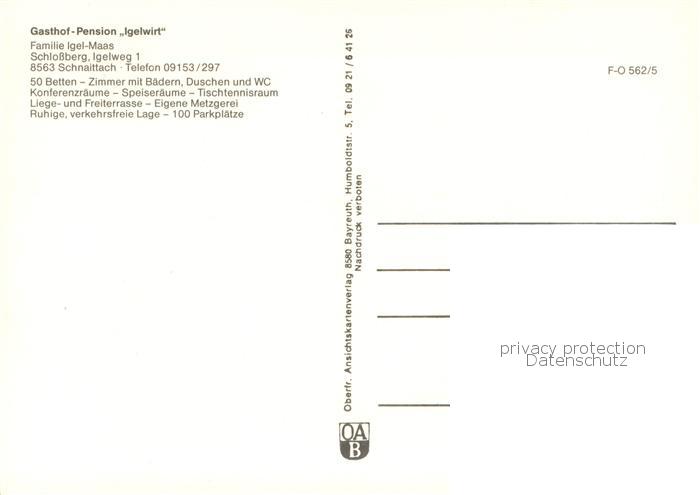 73758509 Schnaittach Gasthof-Pension Igelwirt postalisch nicht gelaufen Erhaltung siehe scans [LiesaD40] KatCode: 11110009574155