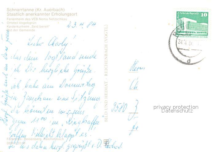 73655124 alte Postkarte Schnarrtanne Ferienheim des VEB Nema Netzschkau OT Vogelsgruen Kinderkurheim Rat der Gemeinde postalisch gelaufen Erhaltung siehe scans [FriedD77] KatCode: 11110014178030
