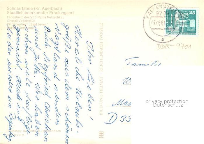 73151719 alte Postkarte Schnarrtanne Ferienheim des VEB Nema Netzschkau OT Vogelsgruen Kinderkurheim Seid bereit Rat der Gemeinde postalisch gelaufen Erhaltung siehe scans [FriedD77] KatCode: 11110014178030