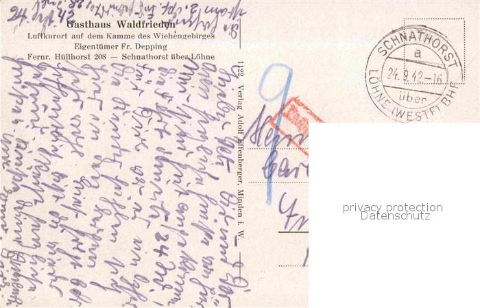 32818832 alte Postkarte Schnathorst Gasthaus Waldfrieden postalisch gelaufen Erhaltung siehe scans [WerneD78] KatCode: 11110005770016