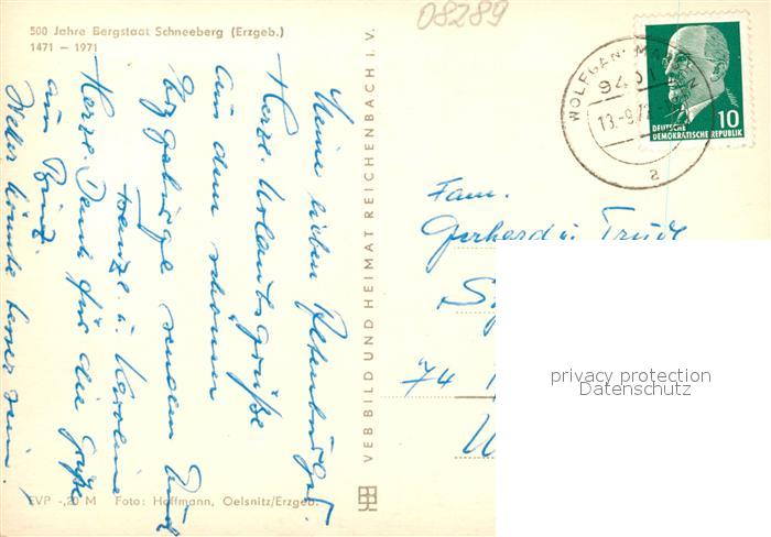 73566081 alte Postkarte Schneeberg Erzgebirge 500 Jahre Bergstadt Ansicht mit Kirche postalisch gelaufen Erhaltung siehe scans [FriedD77] KatCode: 11110014191280