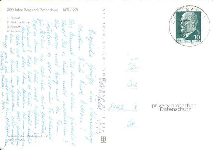 72372458 alte Postkarte Schneeberg Erzgebirge Blick zur Kirche Filzteich Rathaus postalisch gelaufen Erhaltung siehe scans KatCode: 11110014191280