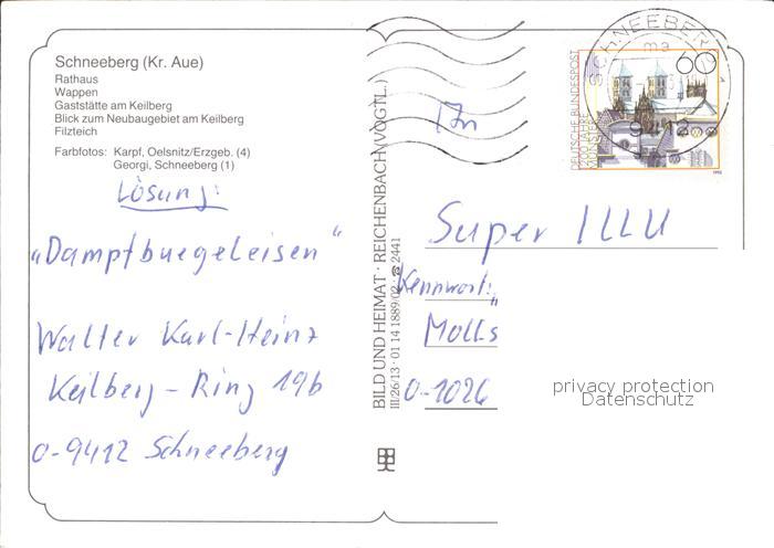 72288323 alte Postkarte Schneeberg Erzgebirge Rathaus Wappen Gaststaette am Keilberg postalisch gelaufen Erhaltung siehe scans KatCode: 11110014191280