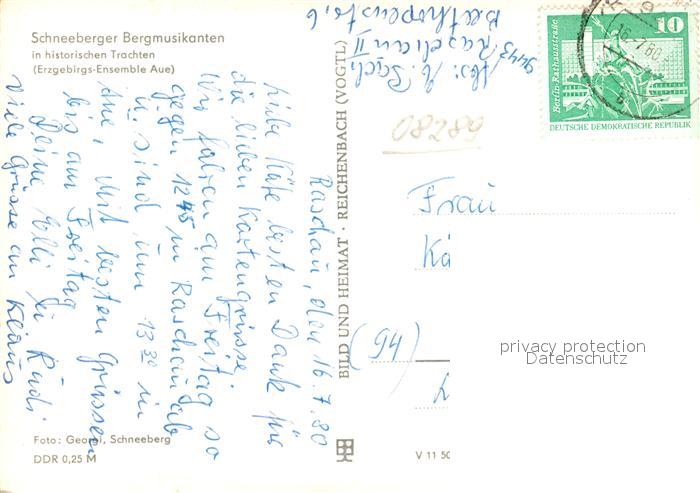 73567060 alte Postkarte Schneeberg Erzgebirge Schneeberger Bergmusikanten in historischen Trachten postalisch gelaufen Erhaltung siehe scans [FriedD77] KatCode: 11110014191280