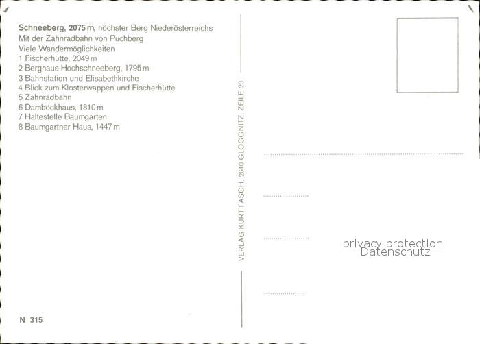 72533927 Schneeberg Oesterreich Fischerhuette Berghaus Hochschneeberg Bahnstation Elisabethkirche Klosterwappen Zahnradbahn Dambockhaus Haltestelle Baumgartner Haus postalisch nicht gelaufen Erhaltung siehe scans [WerneD78 kt116box] KatCode: 11390