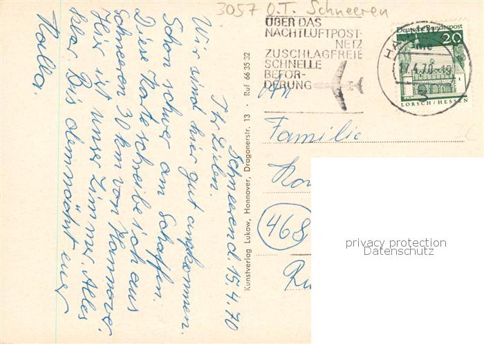 73870172 alte Postkarte Schneeren Kriegerdenkmal Ortsblick Waldschule Partie am Brink Dorfpartie Am Teich postalisch gelaufen Erhaltung siehe scans [WerneD78] KatCode: 11110003241012