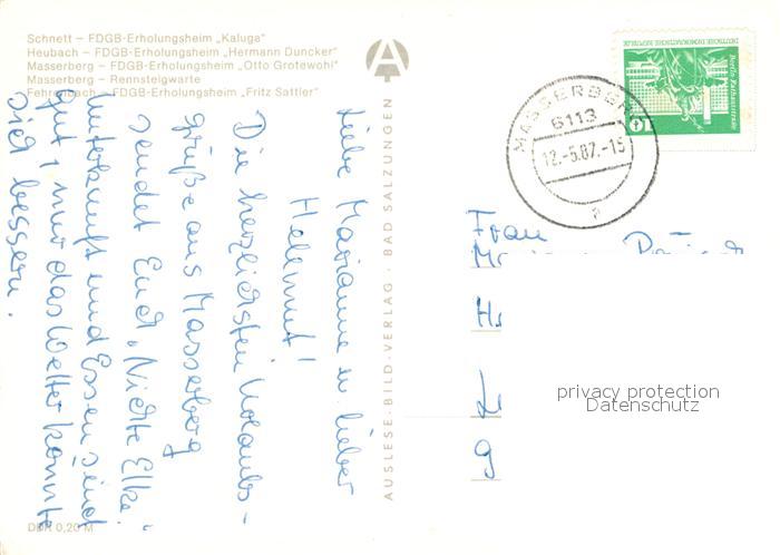 73101048 alte Postkarte Schnett FDGB Erholungsheime Kaluga Hermann Duncker Otto Grotewohl Fritz Sattler Masserberg Rennsteigwarte postalisch gelaufen Erhaltung siehe scans [WerneD78] KatCode: 11110016069061
