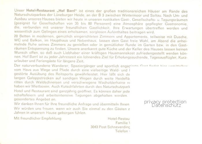 73338808 Schneverdingen Hotel Hof Barrl Restaurant Fachwerk Reiter postalisch nicht gelaufen Werbekarte (keine Postkarte) Erhaltung siehe scans [WerneD78] KatCode: 11110003358019