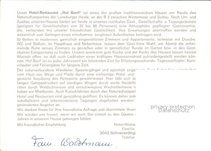 72551246 Schneverdingen Hotel Restaurant Hof Barrl postalisch nicht gelaufen Werbekarte (keine Postkarte) Erhaltung siehe scans [LiesaD40] KatCode: 11110003358019