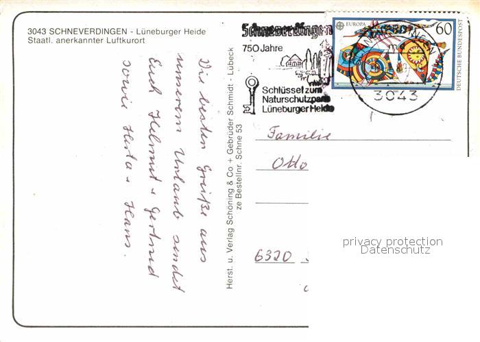 72770131 alte Postkarte Schneverdingen Schulstrasse Evangelische Kirche Quellenbad Verkehrsamt Rathaus postalisch gelaufen Erhaltung siehe scans [AndreD76] KatCode: 11110003358019