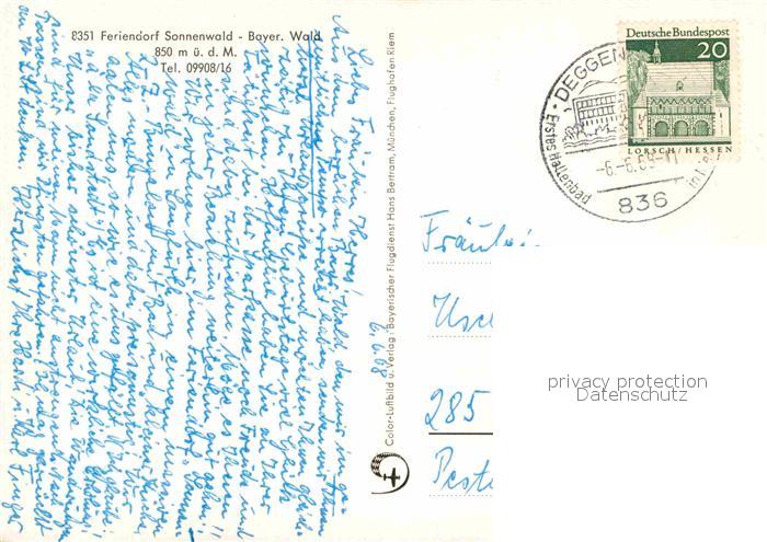 72795642 alte Postkarte Schoefweg Feriendorf Sonnenwald am Brotjacklriegel Nationalpark Bayerischer Wald Fliegeraufnahme postalisch gelaufen Erhaltung siehe scans [FriedD77] KatCode: 11110009272145