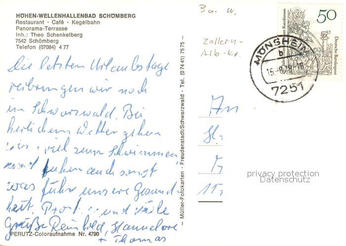 73643608 alte Postkarte Schoemberg Schwarzwald Hoehen Wellenhallenbad Schoemberg Restaurant Hallenbad Kegelbahn postalisch gelaufen Erhaltung siehe scans [WerneD78] KatCode: 11110008235065