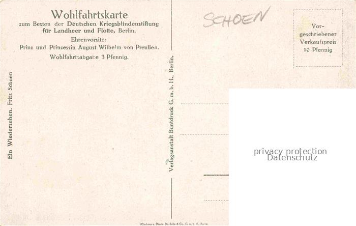 74035363 SCHOEN Fritz Kuenstlerkarte WK1 Soldat Berlin Flotte Landheer August Wilhelm Preussen postalisch nicht gelaufen Erhaltung siehe scans [SanaeD93] KatCode: 22240000003210