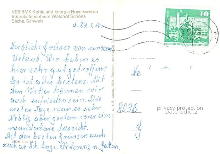 73271461 alte Postkarte Schoena Bad Schandau Betriebsferienheim Waldhof VEB BMK Kohle und Energie Hoyerswerda postalisch gelaufen Erhaltung siehe scans [FriedD77] KatCode: 11110014287020