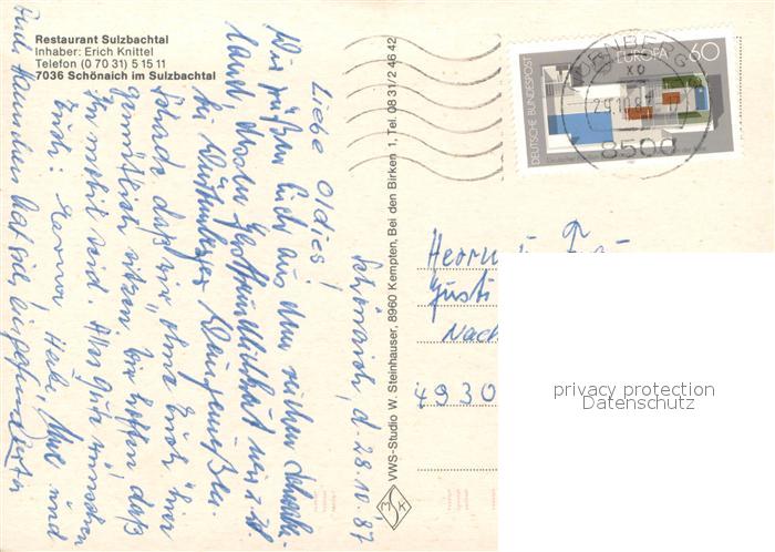 73725389 alte Postkarte Schoenaich Wuerttemberg Restaurant Sulzbachtal Gaststube Speisesaal postalisch gelaufen Erhaltung siehe scans [WerneD78] KatCode: 11110008115044