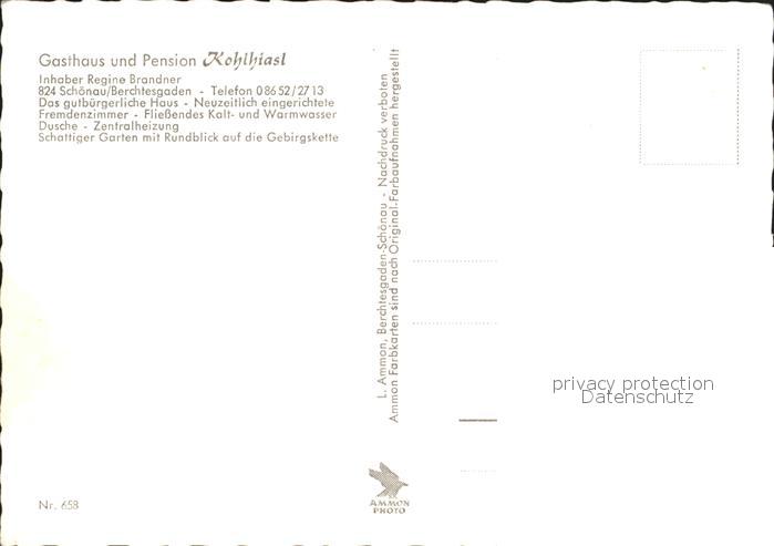 72309330 Schoenau Berchtesgaden Gasthaus Pension Kohlhiasl postalisch nicht gelaufen Erhaltung siehe scans KatCode: 11110009172116