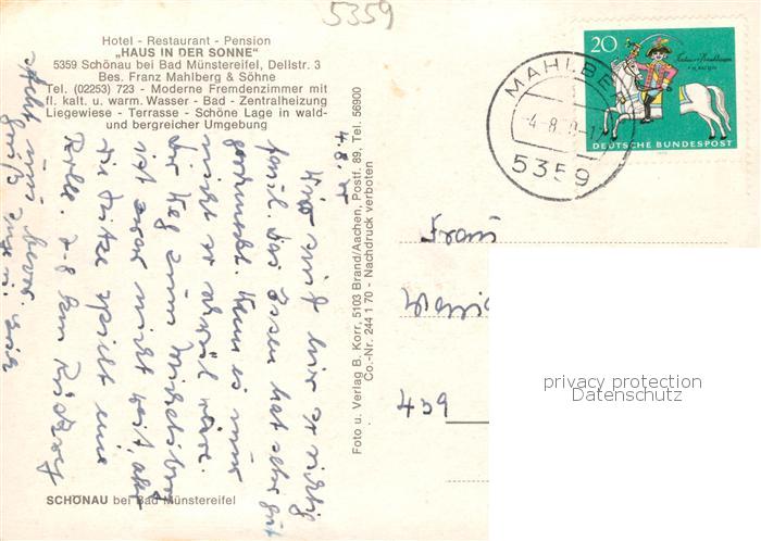 73861396 alte Postkarte Schoenau Eifel Panorama Blick auf Hotel Restaurant Haus in der Sonne postalisch gelaufen Erhaltung siehe scans [FriedD77] KatCode: 11110005366004