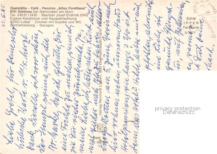 73047455 alte Postkarte Schoenau Gemuenden Cafe Pension Altes Forsthaus Gastraeume postalisch gelaufen Erhaltung siehe scans [WerneD78] KatCode: 11110009677131