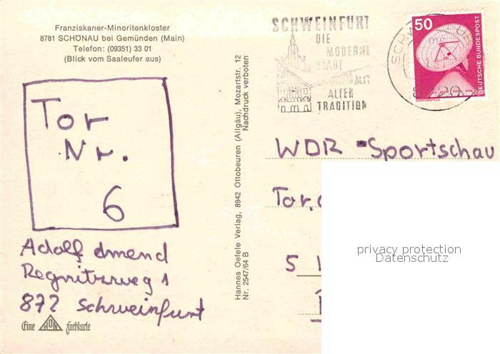 72741028 alte Postkarte Schoenau Gemuenden Franziskaner Minoritenkloster Uferpartie an der Saale postalisch gelaufen Erhaltung siehe scans [FriedD77] KatCode: 11110009677131