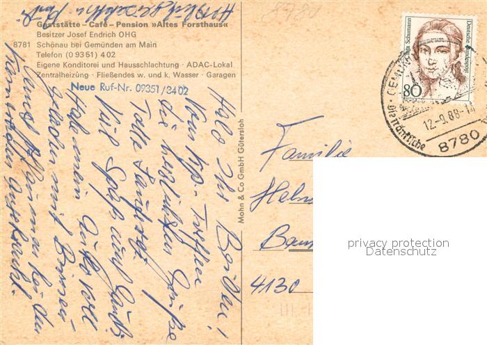 73716181 alte Postkarte Schoenau Gemuenden Zum alten Forsthaus Gaststube postalisch gelaufen Erhaltung siehe scans [WerneD78] KatCode: 11110009677131