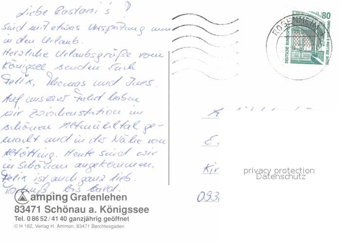 72617148 alte Postkarte Schoenau Koenigssee Camping Grafenlehen postalisch gelaufen Erhaltung siehe scans [WerneD78] KatCode: 11110009172132