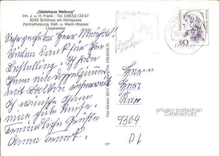 72370279 alte Postkarte Schoenau Koenigssee Gaestehaus Walburg postalisch gelaufen Erhaltung siehe scans KatCode: 11110009172132