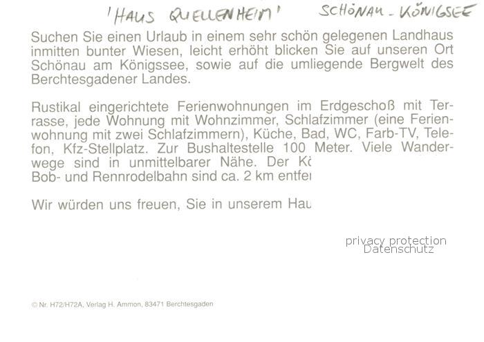 73543020 Schoenau Koenigssee Haus Quellenheim Gaestehaus Pension Landhaus Alpen postalisch nicht gelaufen Werbekarte (keine Postkarte) Erhaltung siehe scans [FriedD77] KatCode: 11110009172132