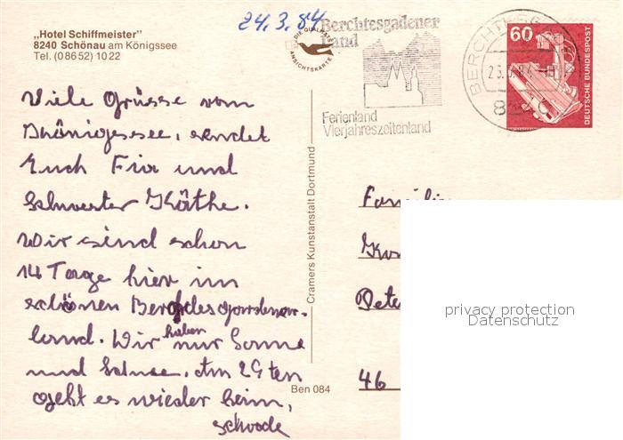 73333495 alte Postkarte Schoenau Koenigssee Hotel Schiffmeister Schwimmbad postalisch gelaufen Erhaltung siehe scans [LiesaD40] KatCode: 11110009172132
