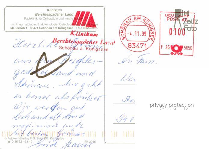 72753298 alte Postkarte Schoenau Koenigssee Klinikum Berchtesgadener Land Alpenblick postalisch gelaufen Erhaltung siehe scans [FriedD77] KatCode: 11110009172132